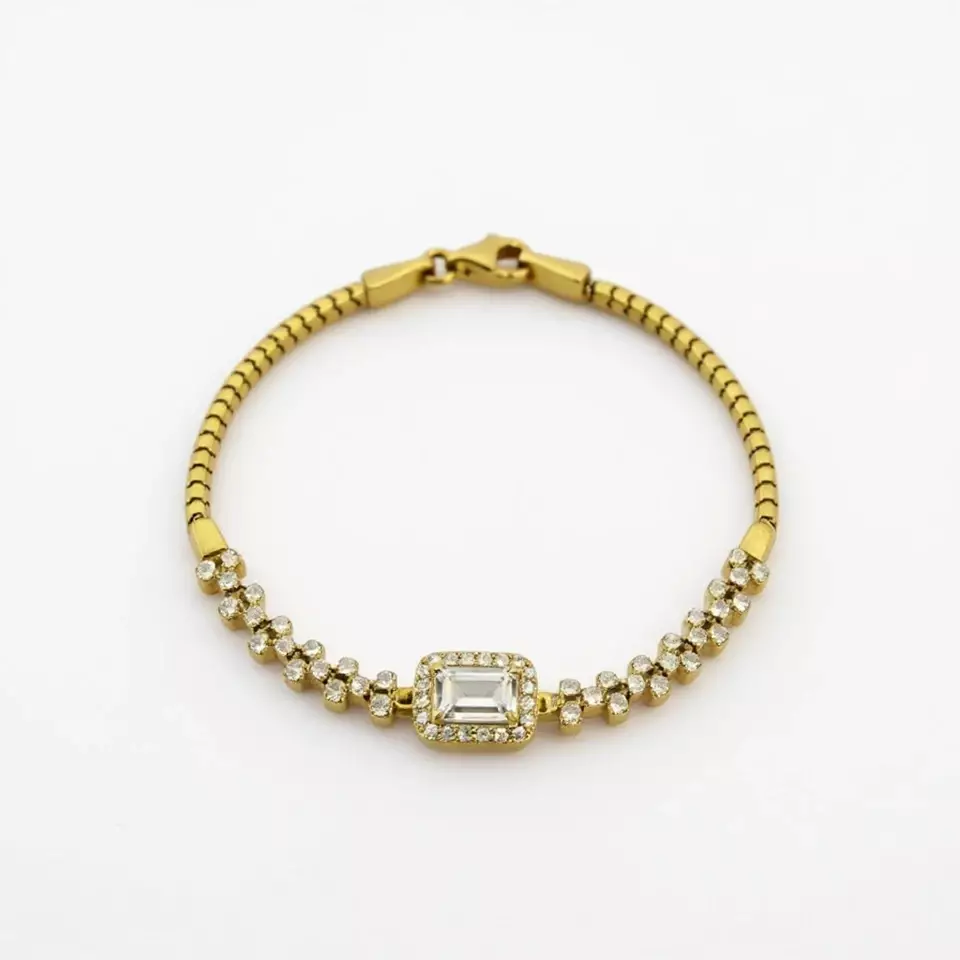 Altının asil ışıltısını, zarif taşların göz kamaştıran parlaklığıyla buluşturan bu bileklik; sofistike bir dokunuş arayanlar için zamansız bir seçim. Ortadaki dikdörtgen kesim taş, modern şıklığın simgesi.