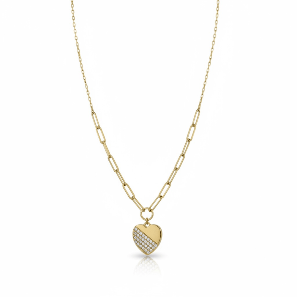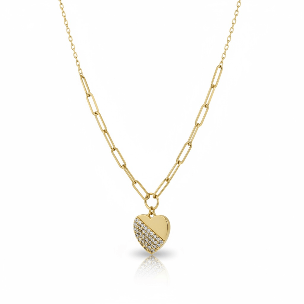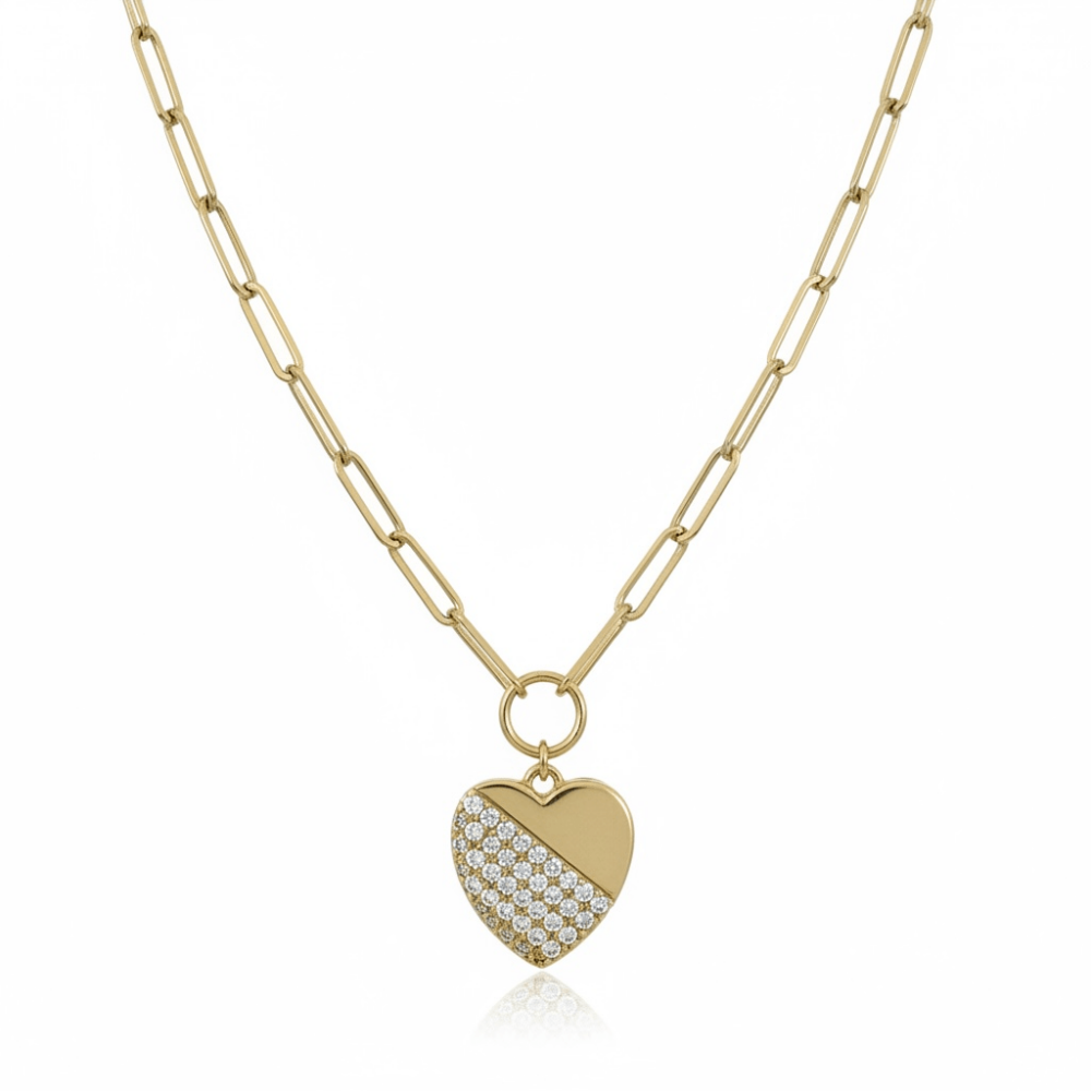 Yarı ışıltı, yarı sade... Half Love Kolye, sevginin dengeli ve modern yorumunu yansıtır. Taşlarla bezeli yüzeyi, düz altın dokuyla buluşarak zarif ama etkisi yüksek bir görünüm sunar. Klasik zincirlerden modern halka form zinciri, tasarıma iddialı bir duruş kazandırır. Minimal kalp formu sayesinde günlük kombinlerde sade bir şıklık sağlar.