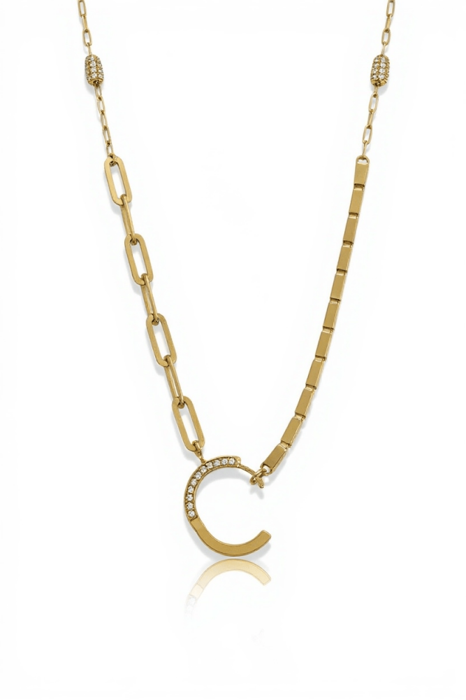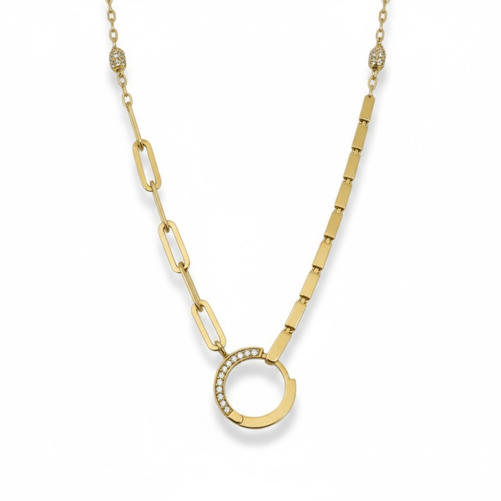 Farklı zincir formlarının zarif dengesinden doğan bu kolye, geçmeli halka kilidiyle modern bir yorum taşır. Taş detayları, sade tasarımına ışıltılı bir vurgu yaparken, geometrik zincir halkaları gücü ve zarafeti aynı anda yansıtır.