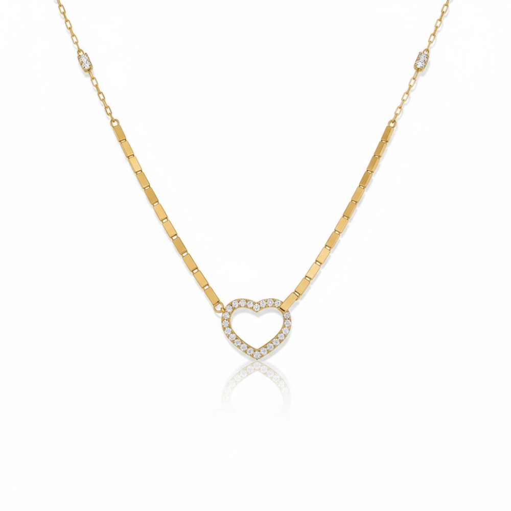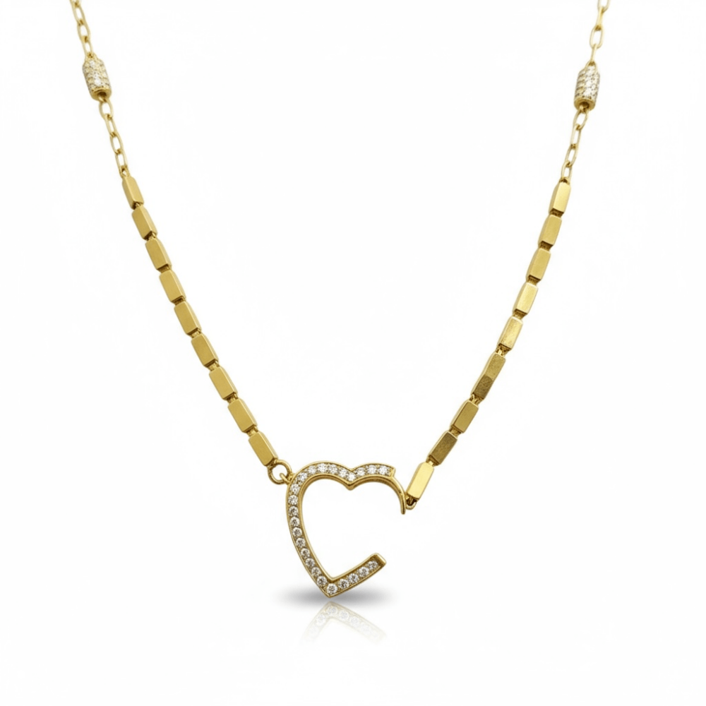 Kilit formundaki kalp detayıyla aşkın hem zarafetini hem de gücünü yansıtan bu özel tasarım, modern zincir halkalarıyla tamamlanıyor. Kalp figürü aynı zamanda kolyenin merkez kilidi olarak işlev görür; böylece anlam ve işlev tek bedende buluşur.