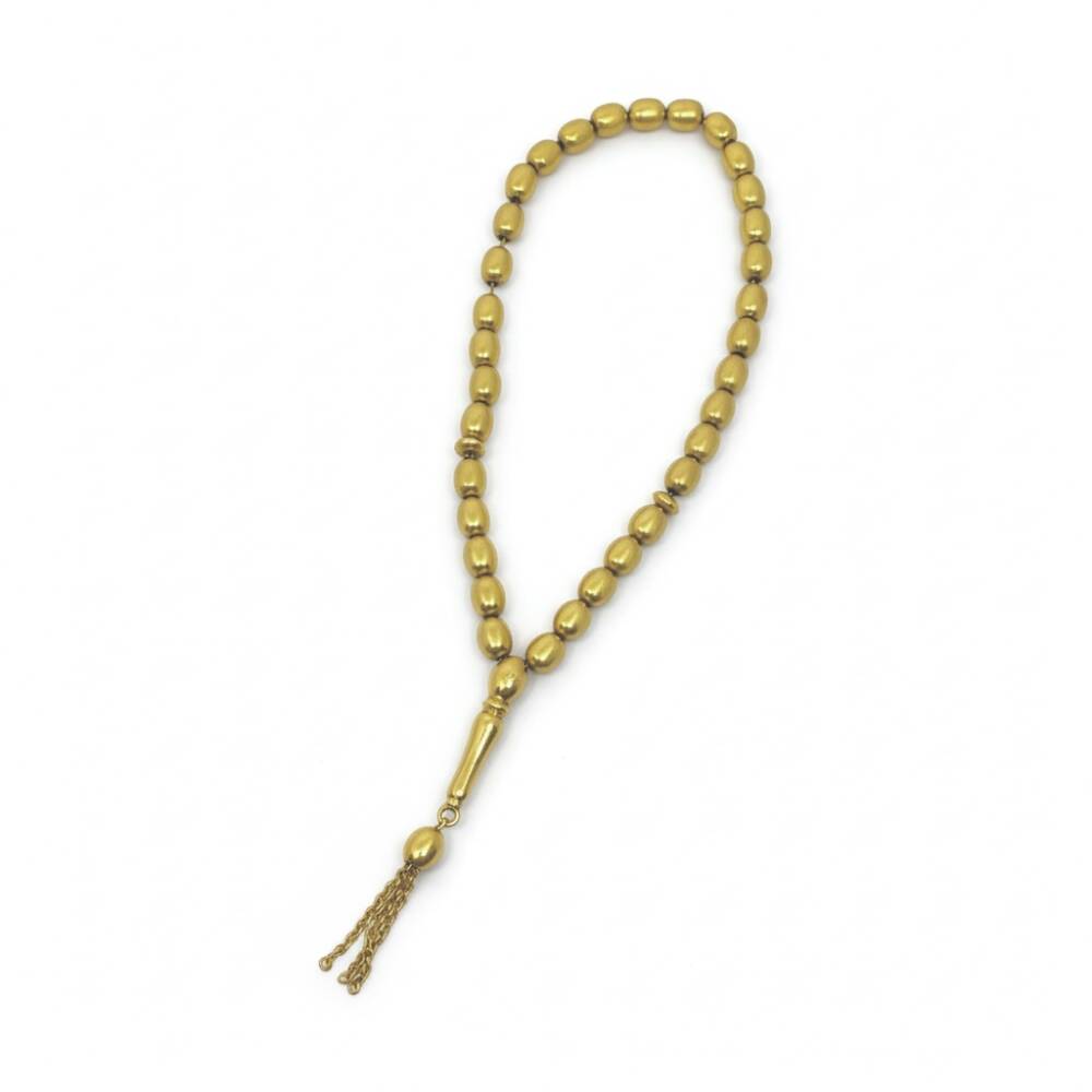 Tamamı 14 ayar altından tasarlanan bu özel tespih, oval formlu taneleri ve ince püskül detayıyla klasik ve özel gün hediyeleri için ideal bir seçenektir.