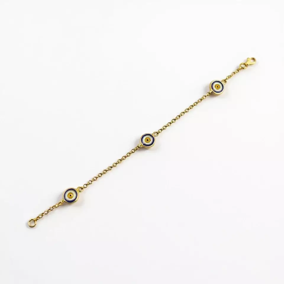 Miniklerin nazardan korunması için zarif ve sevimli bir dokunuş! Üç adet minyatür nazar boncuğu detayıyla tasarlanan bu altın renkli bileklik, hem şık hem de anlamlı bir hediye alternatifi.