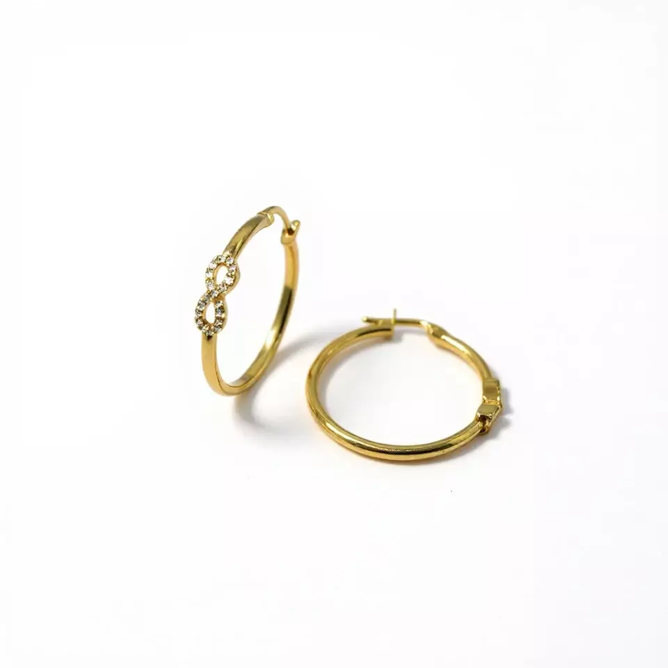 Sonsuzluk sembolüyle süslenen bu altın halka küpe, zarafeti ve anlamı bir araya getiriyor. Işıltılı taş detayları sayesinde hem günlük kombinlerinize romantik bir hava katar hem de özel günlerde şık bir tamamlayıcı olur.