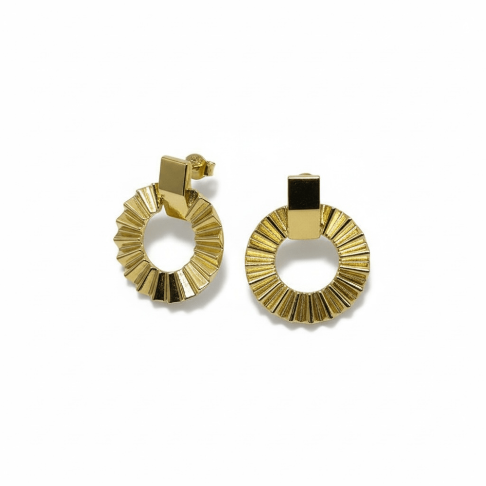Radyal çizgili halkası ve parlak altın yüzeyiyle güneş ışıltısını kulağına taşır. Minimal ama dikkat çekici bir altın küpedir.