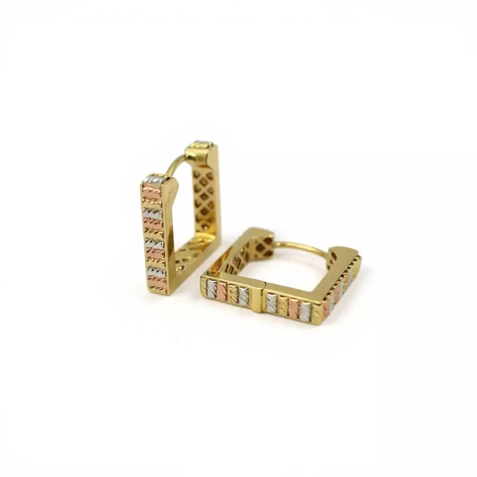 Üç renkli detaylarıyla modern bir stil sunan kare halka küpe, modern çizgileri ve sofistike duruşuyla özgün bir tasarım sunar.