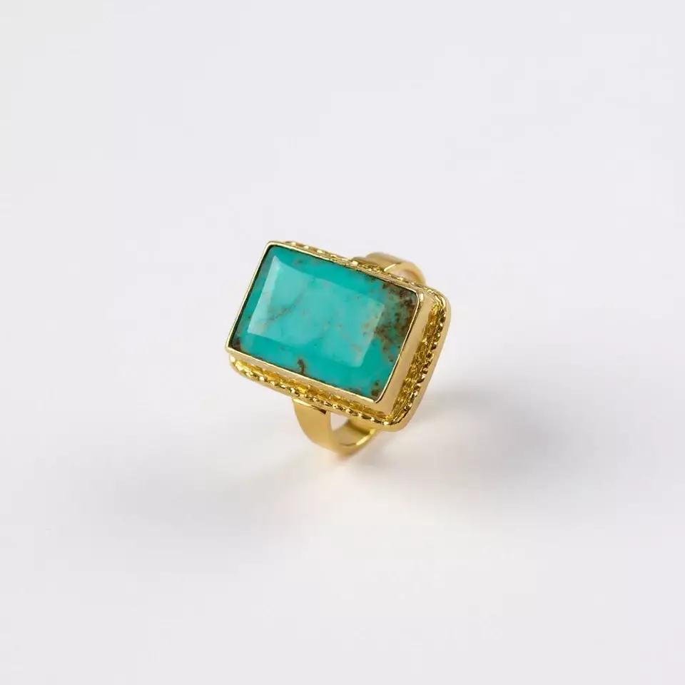 Doğal turkuaz taşının gökyüzünü andıran mavisi, altının asil ışıltısıyla birleşerek güçlü bir enerji ortaya çıkarır. Kare kesimiyle modern bir görünüm sunan bu yüzük, hem zarafeti hem de doğallığı bir araya getirir.