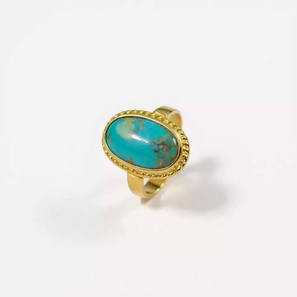 Doğanın gökyüzü tonlarını taşıyan turkuaz taşı, antik çağlardan beri koruyucu ve şifalı etkisiyle bilinir. Altının enerjisiyle birleşerek hem güçlü bir aura hem de şık bir stil sunar. Parmaklarınızda hem zarafeti hem de doğanın dinginliğini hissettirir.