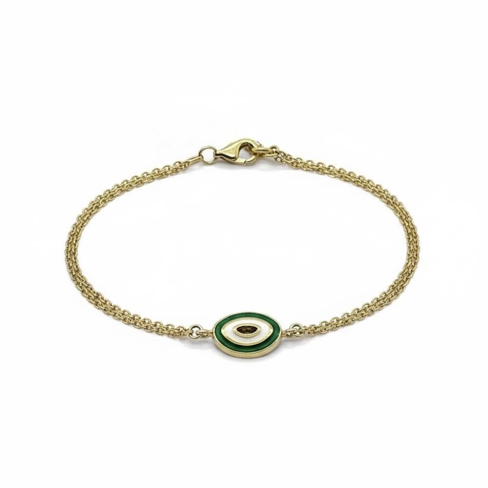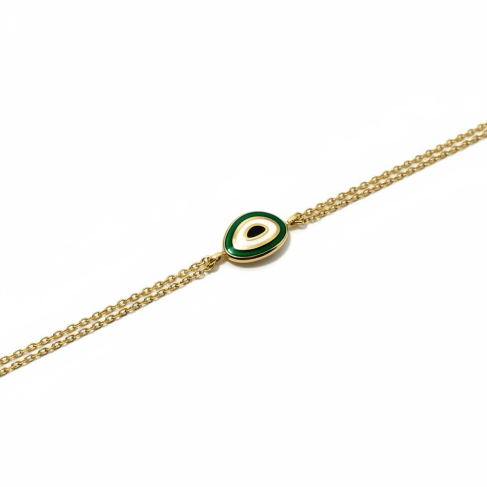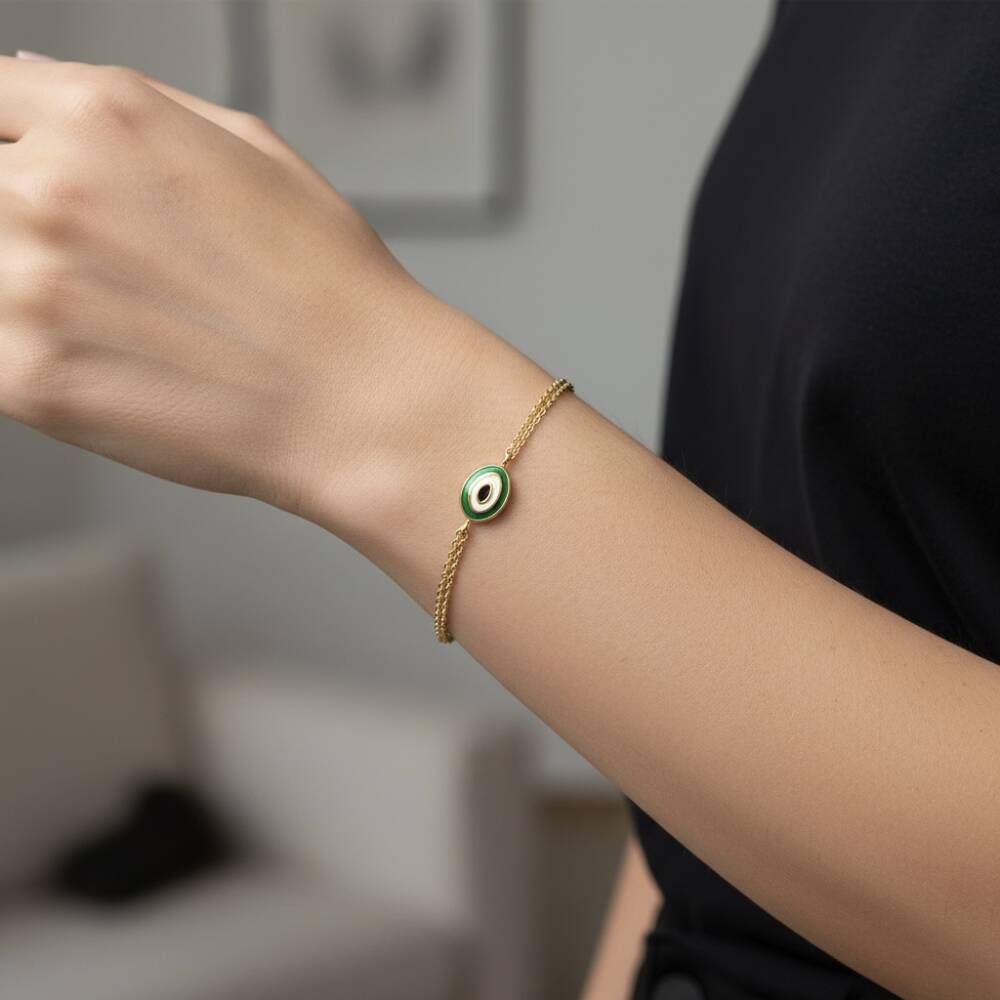 Yeşilin sakin enerjisi ve göz sembolünün koruyucu anlamı bu tasarımda modern bir yorumla buluşuyor. Verde Nazar Bileklik, çift zincir detayı ve göz alıcı renk uyumuyla günlük stilinize sessiz lüks dokunuş ekler. Her anında hem şıklığını tamamlamaya hem de enerjini dengelemeye niyet edilen bir parçadır.