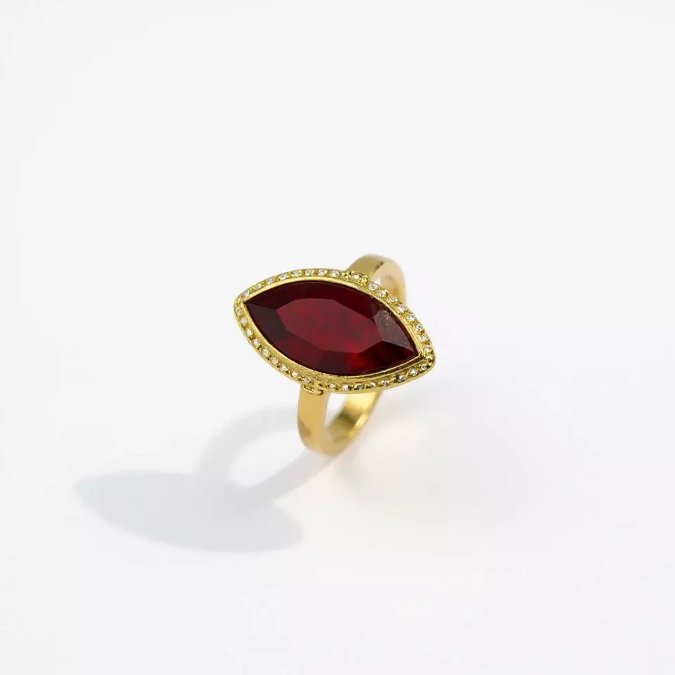 Aşkın ve tutkunun taşı olan yakut, canlı kırmızı rengiyle enerjiyi ve gücü simgeler. Marquise kesimiyle zarif bir duruşa sahip olan bu yüzük, altının asaletini tamamlayarak güçlü ve çarpıcı bir ifade sunar.