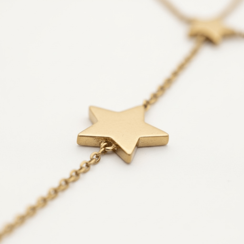 Yıldız formunun ışıltısını taşıyan bu altın şahmeran, bilek ve el arasında akıcı bir silüet oluşturur. İnce zincir yapısı sayesinde hafif, dengeli ve gün boyu konforludur. Tek başına güçlü, katmanlandığında etkileyici bir duruş sunar.